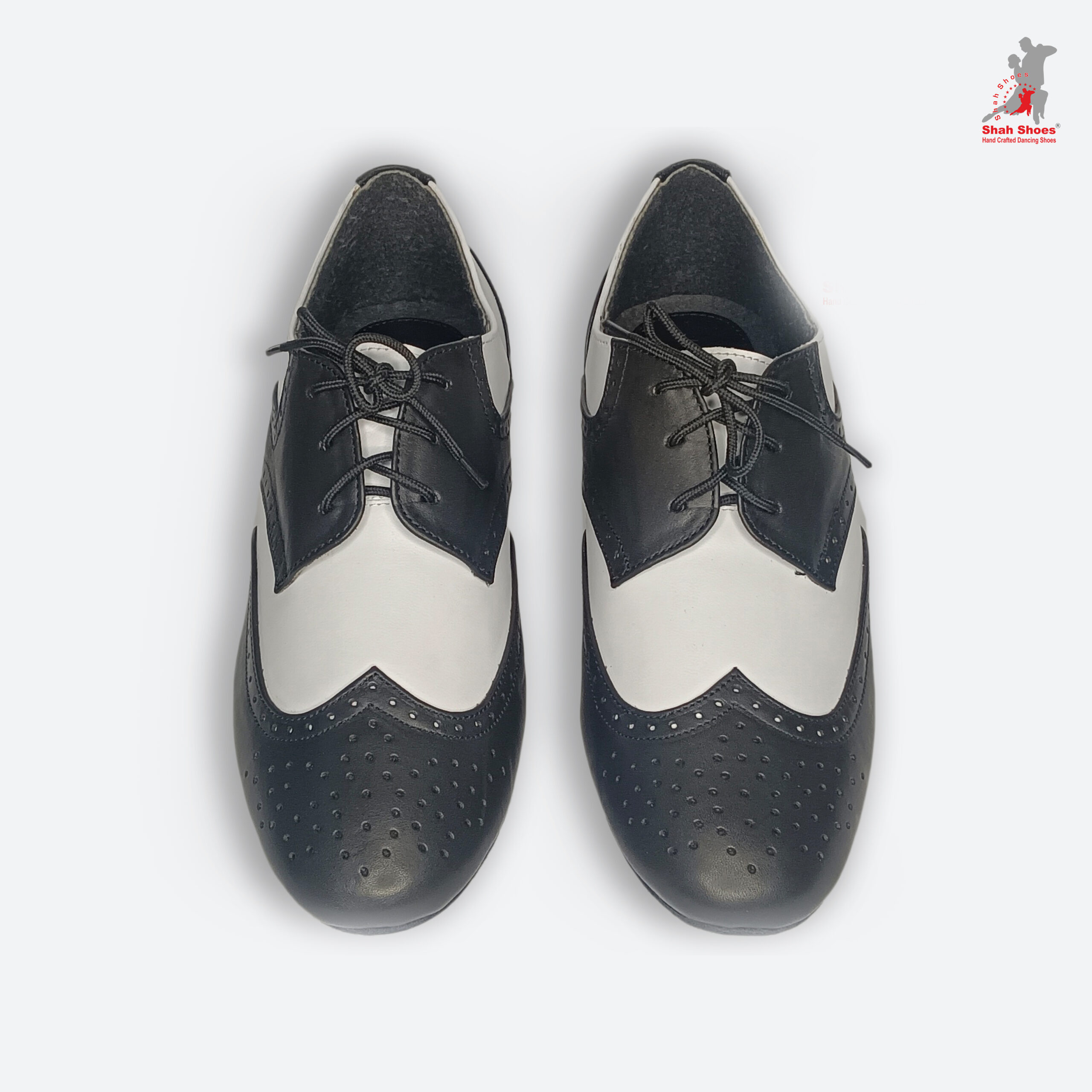 Embrace the timeless style of the 1920s and 30s with this classic two-tone dance shoe. Featuring a bold black and white leather combination in an iconic wingtip brogue design, complete with decorative perforations. The traditional lace-up closure provides a secure fit, while the supportive heel and specialized sole offer the perfect blend of traction and controlled movement essential for Swing, Lindy Hop, and Ballroom dancing. A sophisticated step onto any floor!